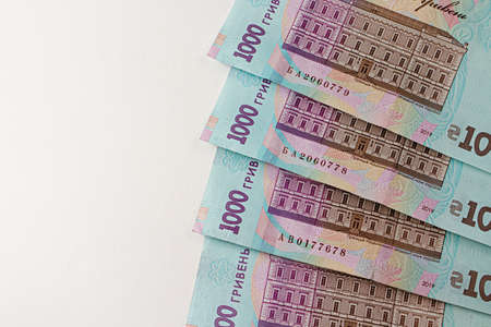 Ukrainian Money backgrounds. 500 banknotes. Hryvnia (UAH). Top view.