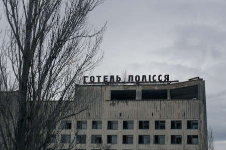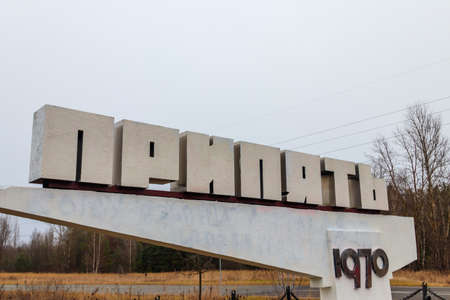 Welcome city sign with inscription: PRIPYAT of abandoned ghost town Pripyat in Chernobyl Exclusion Zone, Ukraine