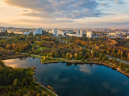 Aerial view of a lake in a park with autumn trees. Kishinev, Moldova. Epic aerial flight over water. Colorful autumn trees in the daytime.