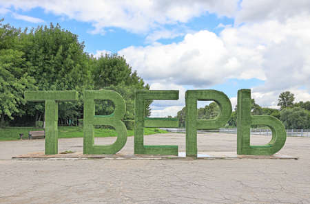 Green letters with the name of the city on the bank of the Volga river. Tver city, Russia, July 30, 2020