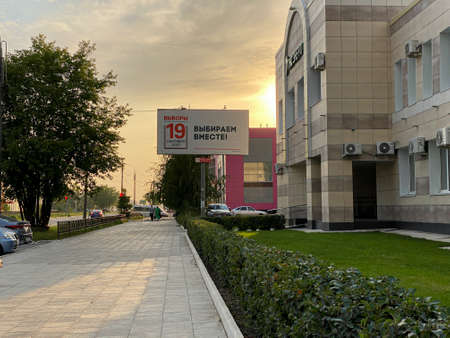 Mari El, Russia - August 20, 2021: Elections billboard in the street in Russia, September, 19. Sunset. The road is on the left, beige buildings is on the right