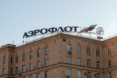 MOSCOW, RUSSIA - February 02, 2021: Logotype of Aeroflot russian airlines in Moscow. Aeroflot is the largest airline of the Russian Federation.