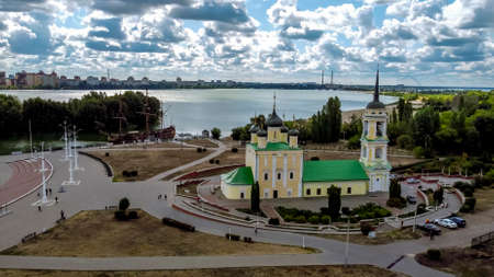 VORONEZH.RUSSIA. 5 september 2021.View from the height over the Admiralteyskaya square , Uspensky Admiralteysky church and floating Museum Gott Predestination on wooden ship.