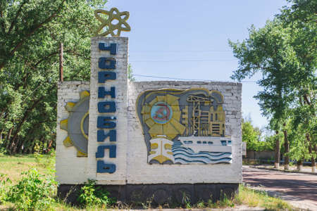 Pripyat, Ukraine, August 2020: Memorial Chernobyl at the entrance to the ghost town