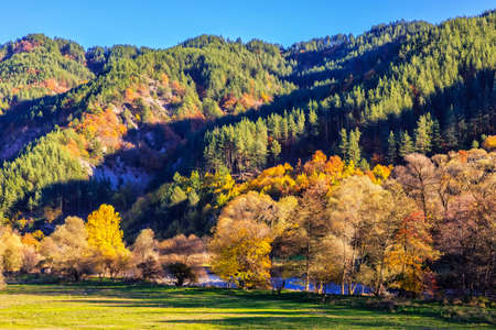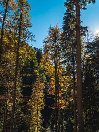 Tall colorful yellow and green autumn trees growing in mountain forest on bright sunny day with blue sky