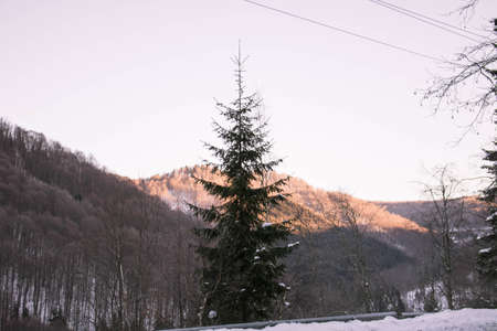 Snowy trees in a fog cloud on the mountain, Evergreen Forest in winter, Racha, Georgia