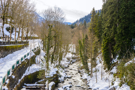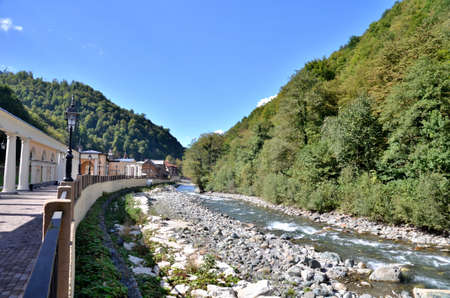 View of the embankment of the river Mtsesta, Krasnaya Polyana, Sochi, Russia.