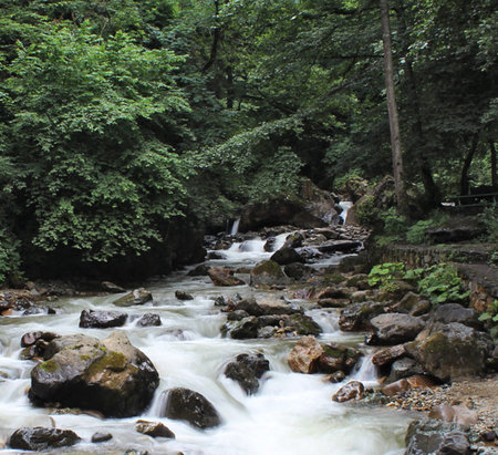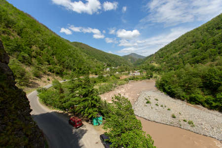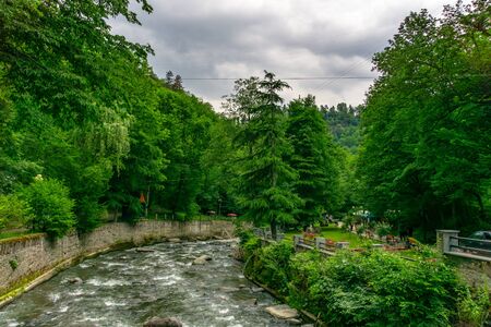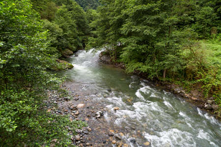 General landscape view of Firtina river in Rize Camlihemsin area flowing among big trees.