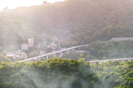 High road overpass above the green forest and residential buildings. Road bridge overpass above green forest valley with dense fog. Sochi, Russia