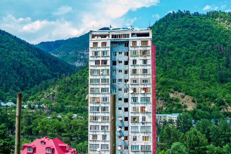 Borjomi/Georgia – July 18, 2019: view of old panel high rise apartment building with mountains, covered with green trees, and blue sky on background.