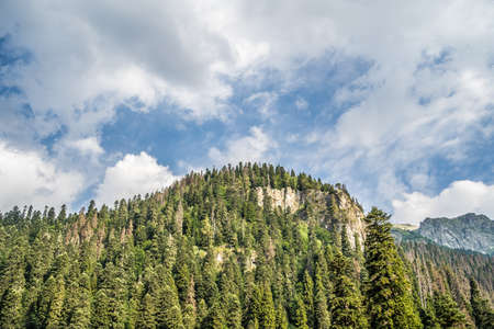 Beautiful sunny landscape of mountains, trees in on the background of blue cloudy sky