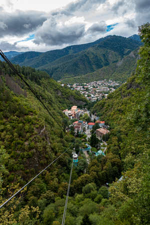 View from the mountain on Borjomi Georgia, with a cable car in the foreground.
