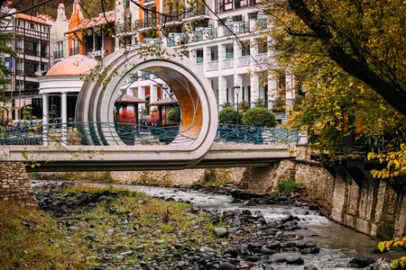 Borjomi, Georgia - September 01, 2021: Twirl Bridge or Mobius Loop Bridge through Borjomula river in Borjomi town. Borjomi is a resort town in Samtskhe Javakheti region of Georgia.