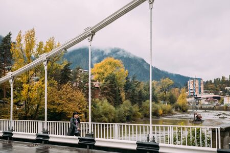 Borjomi, Samtskhe-Javakheti, Georgia. Woman Crossing In Bridge O