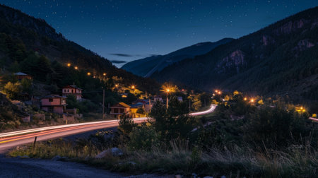 In a remote mountain village the light trails of passing cars offer a sense of connection to the outside world while maintaining the villages peaceful atmosphere
