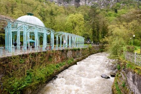 Borjomi, Samtskhe-Javakheti, Georgia. arch Entrance To Pavilion Above Hot Spring Of Borjomi Mineral Water. Famous Local Landmark Is City Park