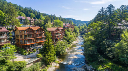Enjoy a picturesque riverfront view featuring charming cabins nestled among lush forests. A perfect setting for nature lovers seeking tranquility.