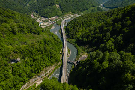 Cable-Stayed Bridge on the Adler-Krasnaya Polyana motorway. Aerial view of car driving along the winding mountain road in Sochi, Russia.