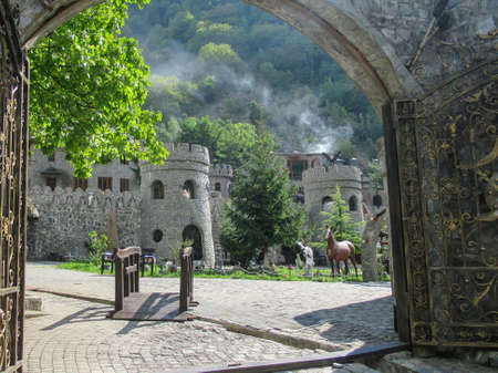 Gakh, Azerbaijan, July 5 2020 : Sangar Qala Resort Azerbaijan, Gakh. Castle building on the background of a green Caucasus mountains.