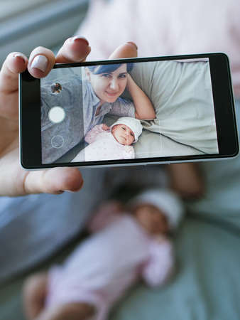 smartphone selfie family newborn mother concept. photo memory. happy motherhood.