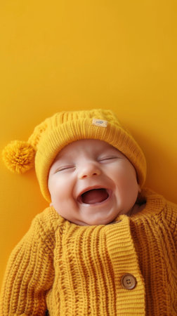 happy newborn baby smile in yellow background