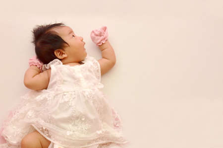 Baby looks at the blank space top view on white background