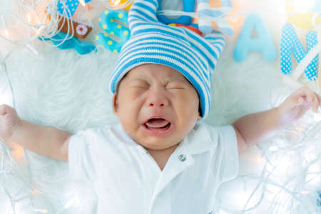 Newborn crying baby boy. Newborn child tired and hungry after posing
