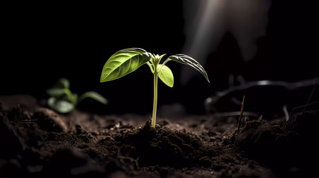 Plant emerging from soil, illuminated by natural light, symbolizing growth and technology in modern agriculture.