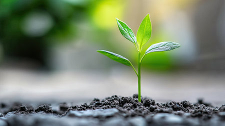 A young plant sprouting from the soil, with sunlight shining on it. The background is blurred and green, creating an atmosphere of growth and vitality. This scene symbolizes new beginnings in nature, in the style of stock photography, natural light, high resolution, high quality, high detail, 3D rendering, bright sunny day, white balance, global illumination. --chaos 30 --ar 16:9 --v 6.1 Job ID: 2f1c2610-cca1-4b13-8c05-fff7f3244f55