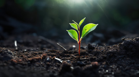 Small green plant sprouting from dark soil, symbolizing growth and renewal in natural environment. sunlight gently illuminates leaves, creating serene and hopeful atmosphere