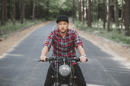 Man seat on the caferacer motorcycle on the forest road during sunset.