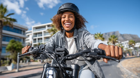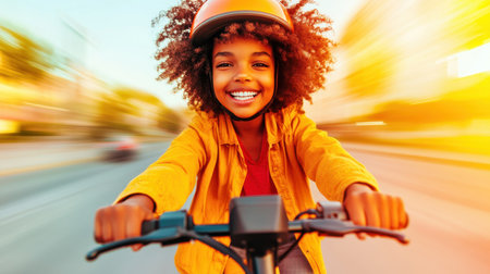 A girl with curly hair wearing a helmet rides her bike through a lively city street, beaming with happiness as the sun sets, creating a warm glow in the background.