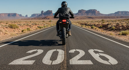 A low-angle perspective shows a person riding a motorcycle down a long desert highway, with the large white numbers 2026 clearly visible on the road surface, signifying a future path.