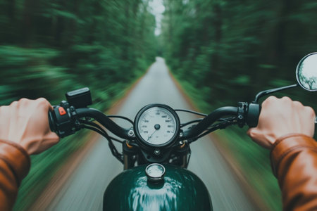 Capture the thrill of a motorcycle ride on a scenic road, showcasing the handlebars against a backdrop of nature. Experience a sense of freedom and adventure.