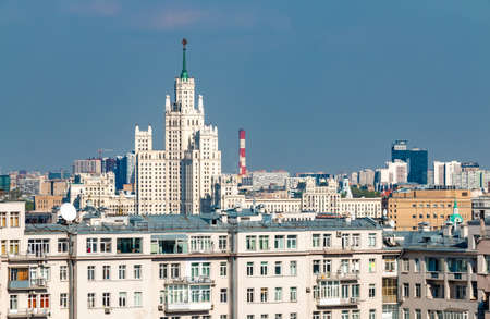 Cityscape of Moscow with houses and high-rise tower in soviet architecture style, Russia capital city center