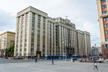 Moscow, Russia – June 8, 2017. Exterior view of the State Duma building at 1 Okhotny Ryad Street in Moscow, with people and cars. The State Duma is the lower house of the Federal Assembly of Russia.