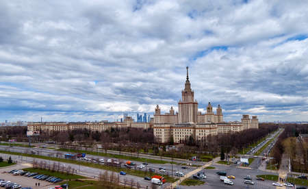 Moscow, Russia - May 13 2021: Aerial panoramic view of sunset campus buildings of famous Moscow university under dramatic cloudy sky in spring