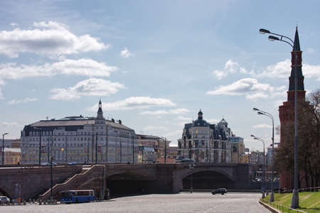 View of the Moscow Kremlin and Bolshoy Kamenny Bridge from Patriarshy Bridge. Moscow. Russia