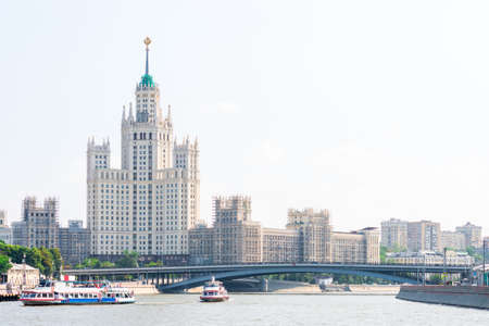 Beautiful view of Moscow. Stalinist residential building on Moscow River embankment. Russia.