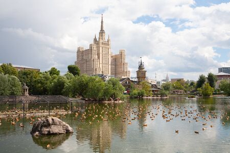 MOSCOW, RUSSIA - JULY 7, 2018: Many ducks swimming on pond in Zoo in Bolshaya Gruzinskaya Street on summer sunny day. Stalin skyscraper on Kudrinskaya Square is on background.