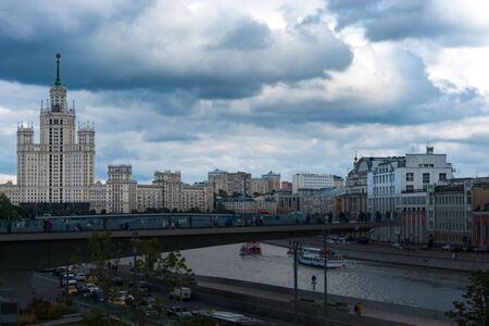 The cityscape is a view of summer Moscow. City, buildings, houses, architecture, Gothic. Blue skies in heavy rain clouds, before the rain. Overcast. Cool