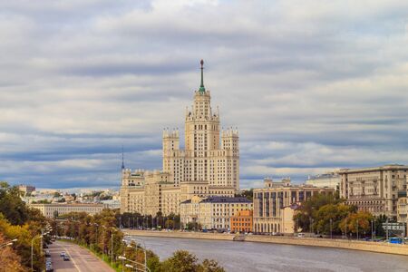 MOSCOW, RUSSIA - OCTOBER 16, 2018: Moskvoretskaya embankment. View of the Stalinist skyscraper on the Kotelnicheskaya embankment