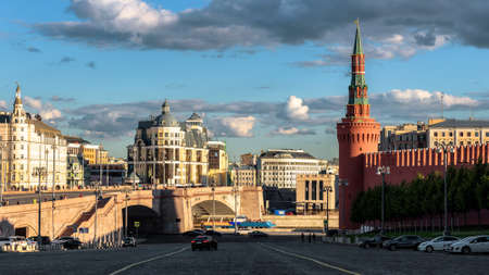 Moscow cityscape, view from Red Square to Bolshoy Moskvoretsky Bridge, Russia. Famous old Kremlin on right. Panorama of Moscow city center at sunset. Historical and modern buildings of Moscow.