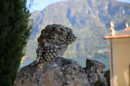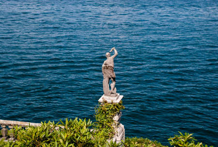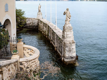 Stone statues on pedestals in the water in front of the balcony of Villa Balbianello. Lake Como, Italy
