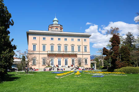 LUGANO, SWITZERLAND - APRIL 17, 2018. Villa Ciani of 19th century in the Park Ciani at the lake Lugano on a spring sunny day. City of Lugano, canton of Ticino, Switzerland, Europe.
