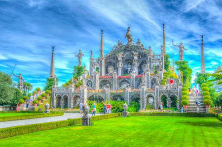 ISOLA BELLA, ITALY, JULY 27, 2017: People are strolling next to the beautiful fountain inside of gardens of the Borromeo Palace on Isola Bella, Italy