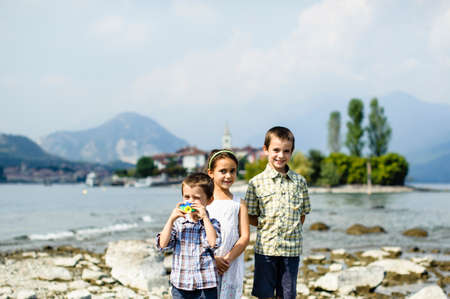 portrait of three children brothers and sister in outdoor on the shores of Lake Maggiore Italy tourists in the summer