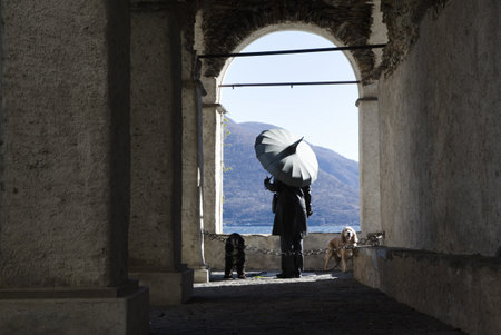 Woman with an Umbrella and Her Dogs Standing in an Arch with Mountain in Ticino, Switzerland.