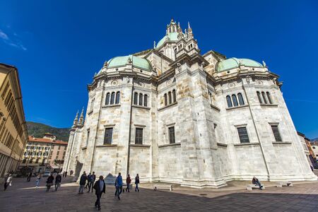 COMO, ITALY - APRIL 23, 2017: Unidentified people by Como Cathedral (Duomo di Como) in Como, Italy. It is is Roman Catholic cathedral opened at 1396.