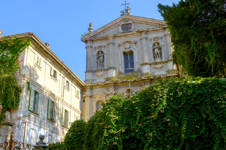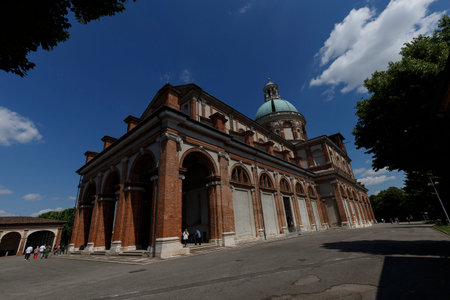 Sanctuary of Vicoforte church facade, low angle view in a sunny summer day in Piedmont, Italy